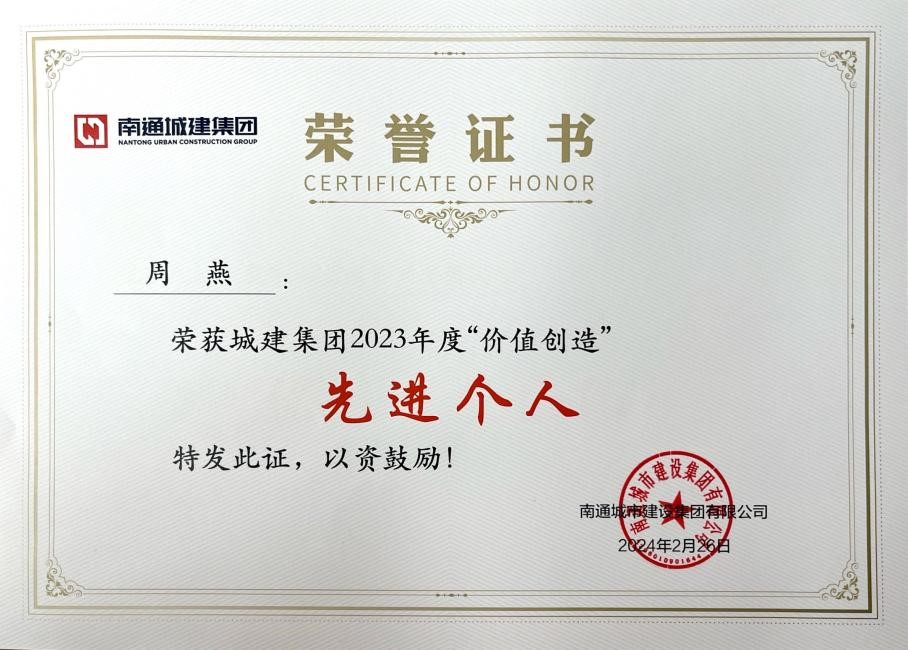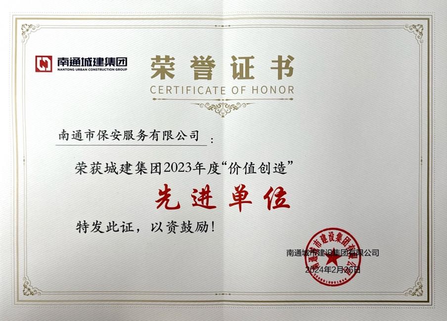 喜报——南通保安公司荣获城建集团“2023年度‘价值创造’先进单位、优秀攻坚团队、先进个人”称号