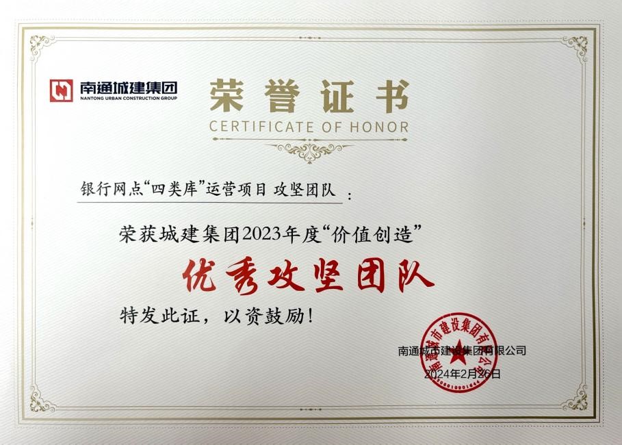 2024年2月26日,南通城市建设集团有限公司举办了2024年度经营工作会议,南通保安公司荣获城建集团“2023年度‘价值创造’先进单位”称号;银行网点“四类库”运营项目 攻坚团队荣获城建集团“2023年度‘价值创造’优秀攻坚团队”称号;红旗驾培周燕荣获城建集团“2023年度‘价值创造’先进个人”称号!